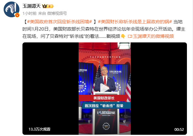 当地时间1月20日,美国财政部长贝森特在世界经济论坛年会现场举办公开活动。谭主在现场,问了贝森特对“斩杀线”的看法……